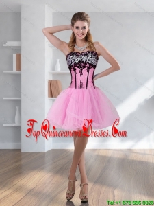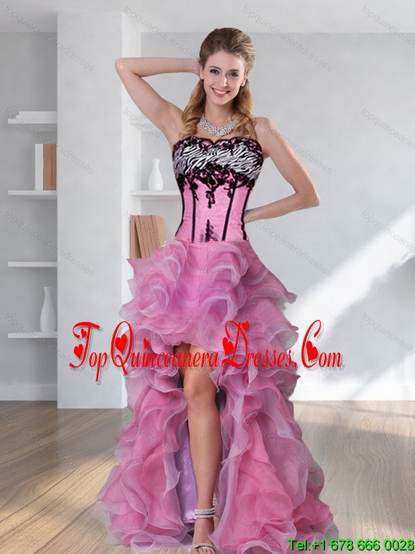 2015 Gorgeous Zebra Printed Strapless High Low Rose Pink Dama Dresses with Embroidery