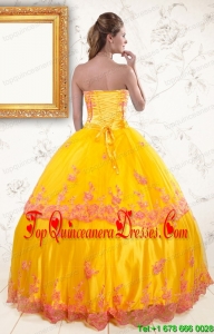 2015 Luxurious Strapless Gold Quinceanera Dresses with Appliques
