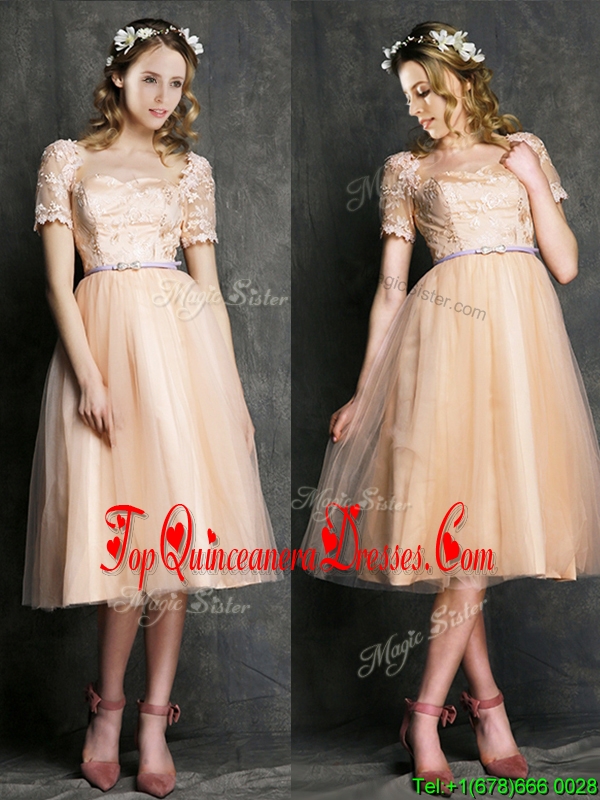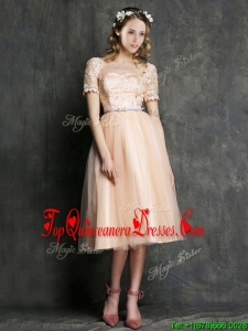 2016 Beautiful Bateau Short Sleeves Dama Dress with Sashes and Lace