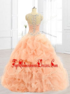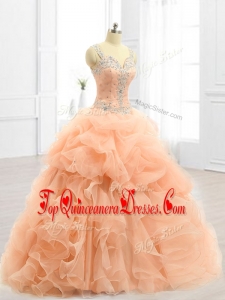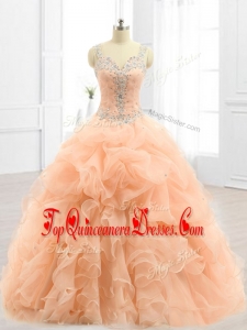 2016 Cheap Real Photo Show Straps Beading and Ruffles Quinceanera Dresses in Peach