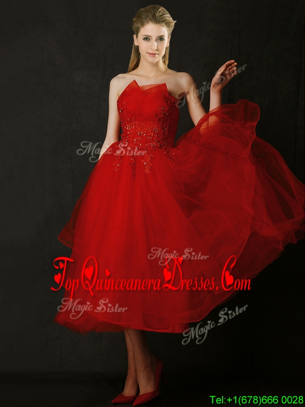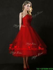 2016 Elegant Tea Length Applique Red Dama Dress with Asymmetrical Neckline