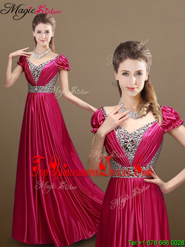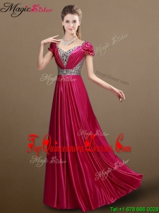 2016 Pretty Empire V Neck Beading Dama Dresses with Short Sleeves