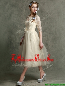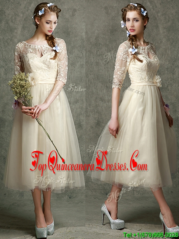 2016 See Through Scoop Half Sleeves Dama Dress with Hand Made Flowers and Lace