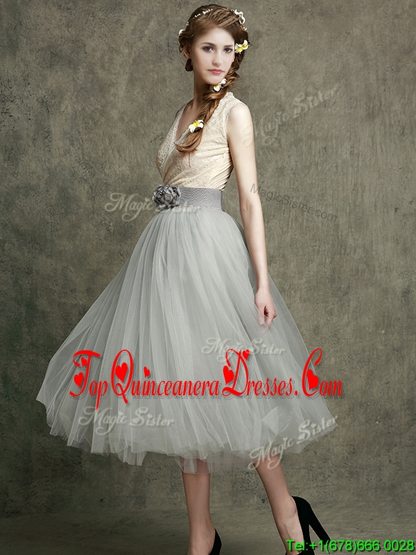 2016 Wonderful Hand Made Flowers and Belted Dama Dress with Tea Length