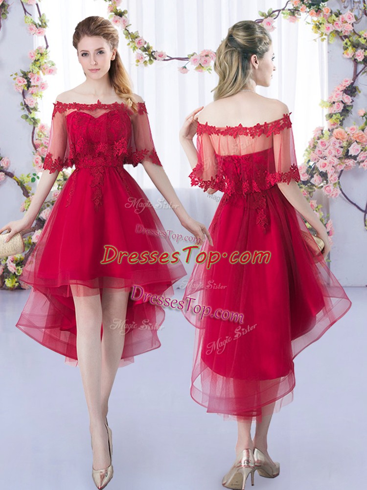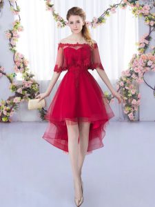 A-line Dama Dress Wine Red Sweetheart Tulle Sleeveless High Low Lace Up