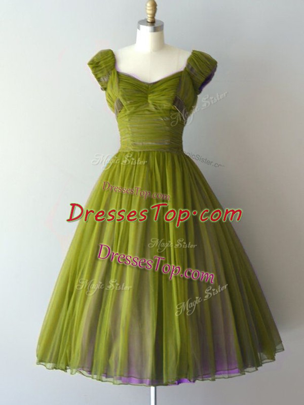 A-line Quinceanera Court of Honor Dress Olive Green V-neck Chiffon Cap Sleeves Knee Length Lace Up