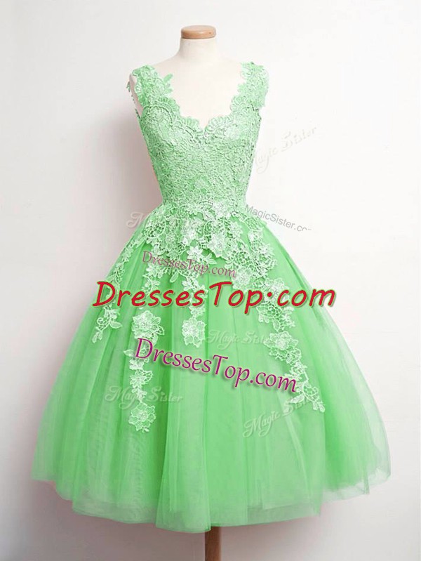 A-line Quinceanera Dama Dress Green V-neck Tulle Sleeveless Knee Length Lace Up
