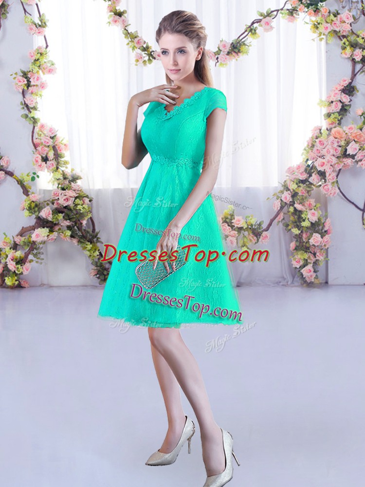 A-line Quinceanera Dama Dress Turquoise V-neck Lace Cap Sleeves Mini Length Lace Up