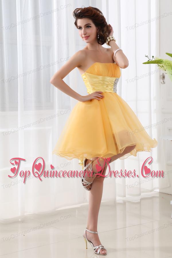 A-line Strapless Organza Gold Mini-length Dama Dress for Quinceaneras with Ruching