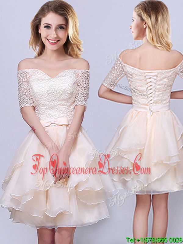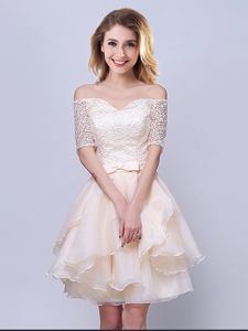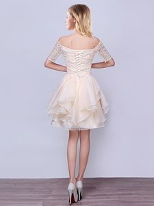 A-line Vestidos de Damas Champagne Off The Shoulder Organza Short Sleeves Mini Length Lace Up