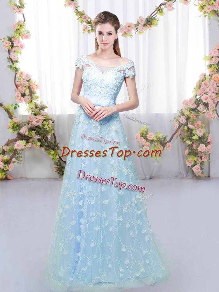 Admirable Blue Tulle Lace Up Court Dresses for Sweet 16 Cap Sleeves Floor Length Appliques