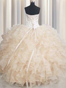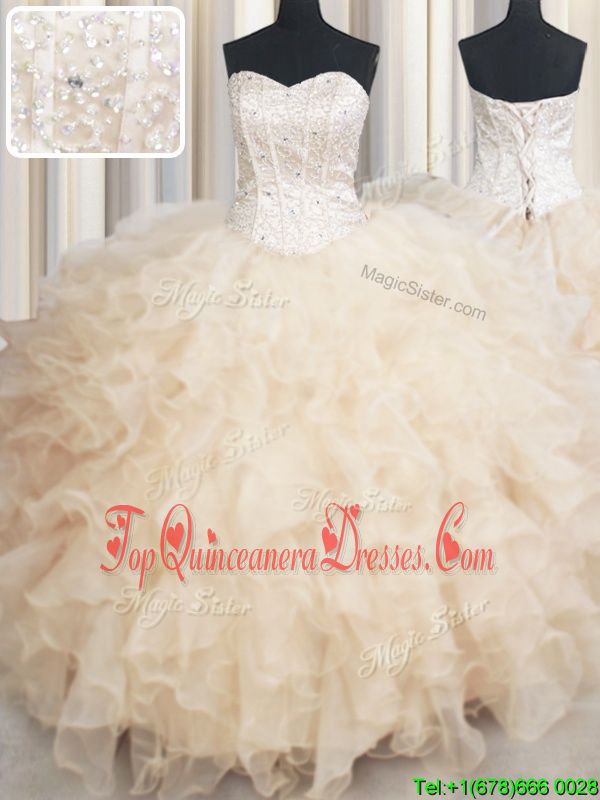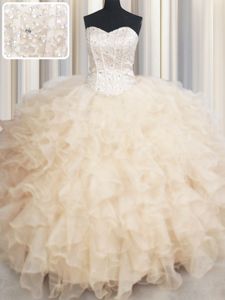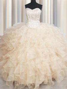 Admirable Champagne Ball Gowns Beading and Ruffles Quinceanera Dresses Lace Up Organza Sleeveless Floor Length