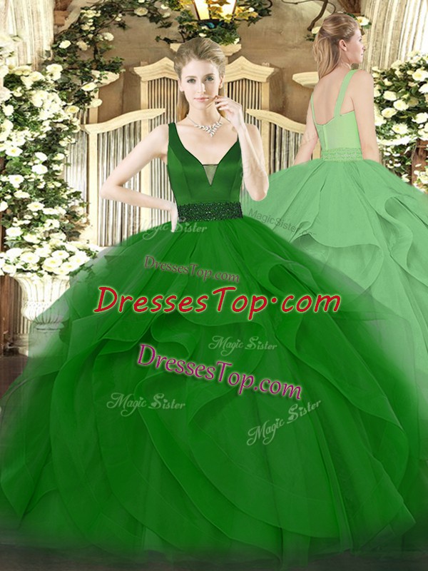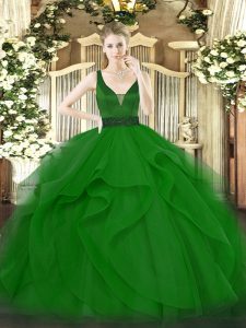 Admirable Dark Green Tulle Zipper Quinceanera Dress Sleeveless Floor Length Beading and Ruffles