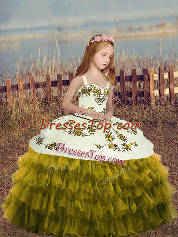 Admirable Olive Green Ball Gowns Organza Straps Sleeveless Embroidery and Ruffles Floor Length Lace Up Child Pageant Dress