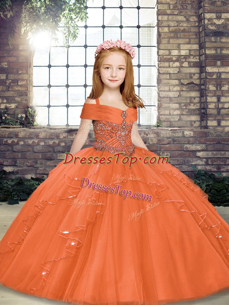 Admirable Orange Ball Gowns Tulle Spaghetti Straps Sleeveless Beading Floor Length Lace Up Child Pageant Dress