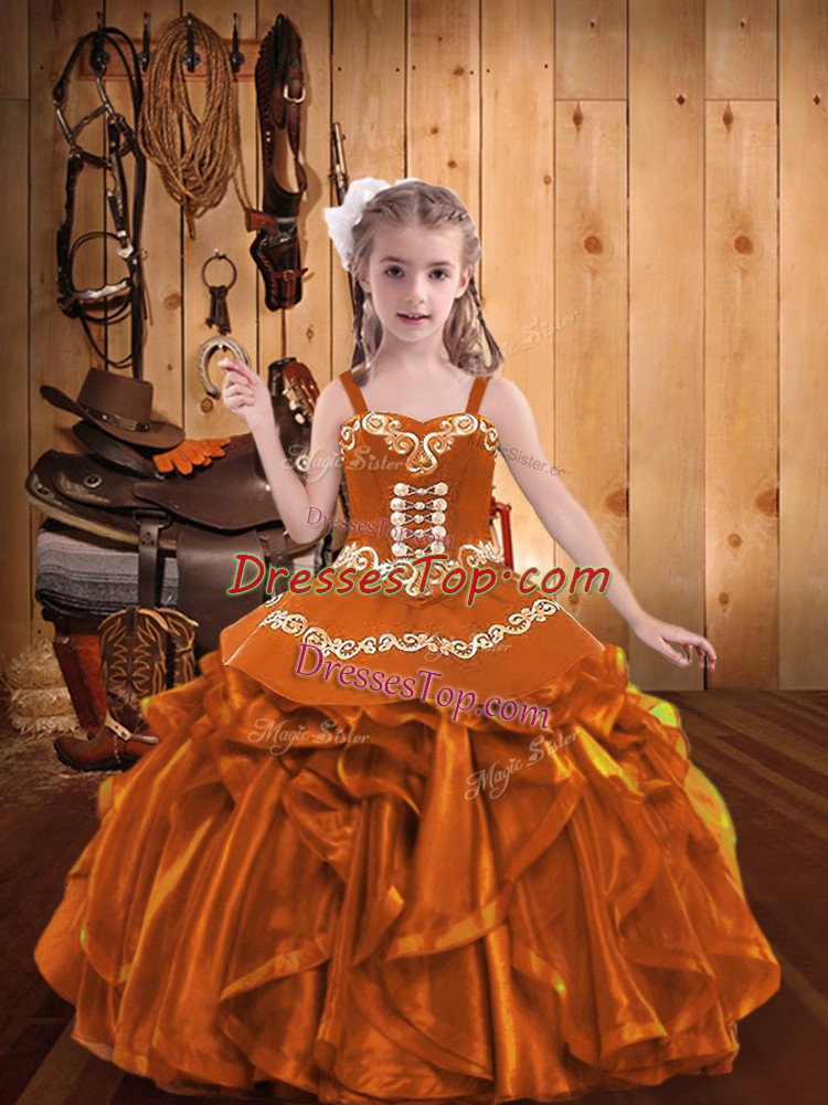 Admirable Orange Straps Neckline Embroidery and Ruffles Kids Pageant Dress Sleeveless Lace Up