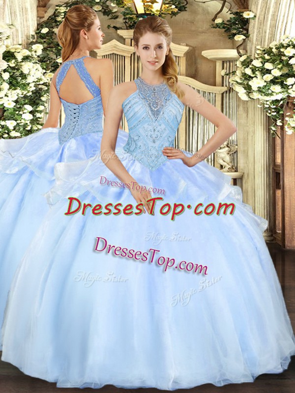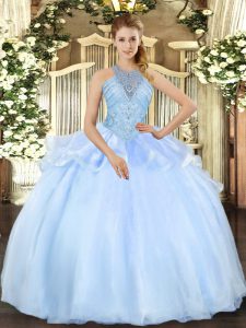 Admirable Organza Halter Top Sleeveless Lace Up Beading Quinceanera Dresses in Light Blue