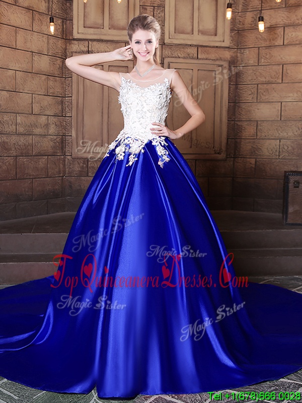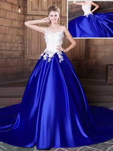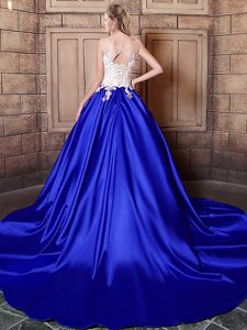 Admirable Royal Blue Scoop Lace Up Appliques Sweet 16 Dress Court Train Sleeveless