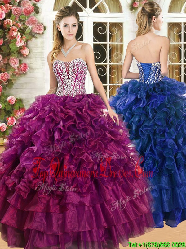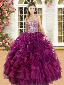 Admirable Ruffled Ball Gowns 15 Quinceanera Dress Burgundy Sweetheart Organza Sleeveless Floor Length Lace Up