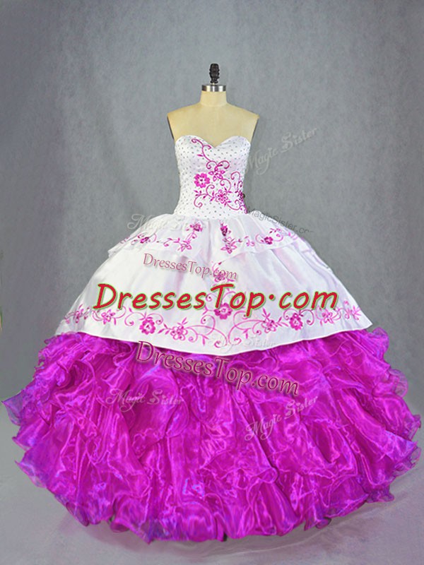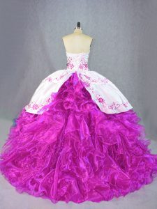 Admirable Sleeveless Beading and Embroidery and Ruffles Lace Up Quinceanera Gowns with Fuchsia Brush Train