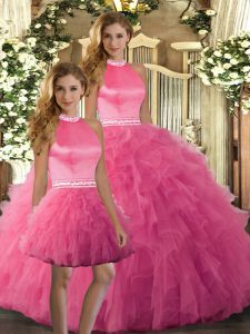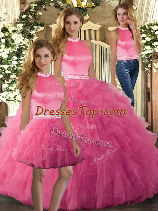 Admirable Three Pieces 15 Quinceanera Dress Hot Pink Halter Top Tulle Sleeveless Floor Length Backless
