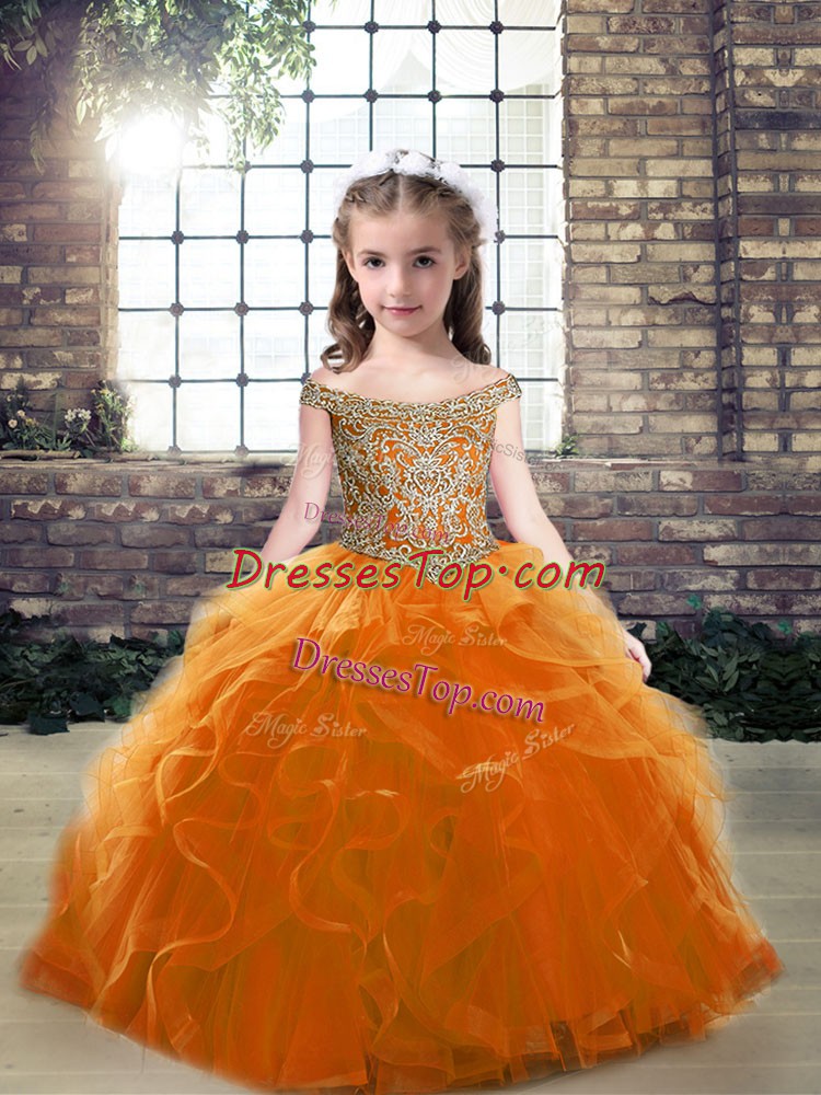 Admirable Tulle Off The Shoulder Sleeveless Lace Up Beading Little Girls Pageant Dress Wholesale in Orange