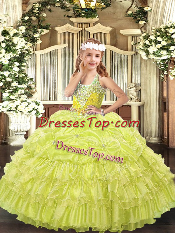 Admirable V-neck Sleeveless Child Pageant Dress Floor Length Beading and Ruffled Layers and Pick Ups Yellow Green Organza