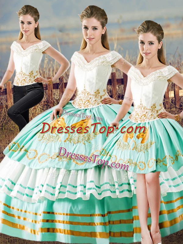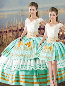 Adorable Apple Green Satin Lace Up V-neck Sleeveless Floor Length Sweet 16 Dress Embroidery and Ruffled Layers