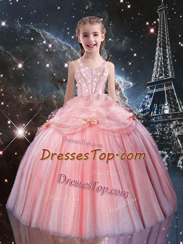 Adorable Floor Length Ball Gowns Sleeveless Rose Pink Pageant Gowns For Girls Lace Up
