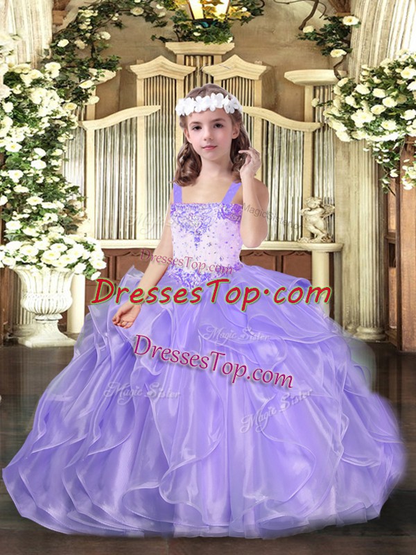 Adorable Floor Length Lavender Little Girls Pageant Dress Organza Sleeveless Beading and Ruffles