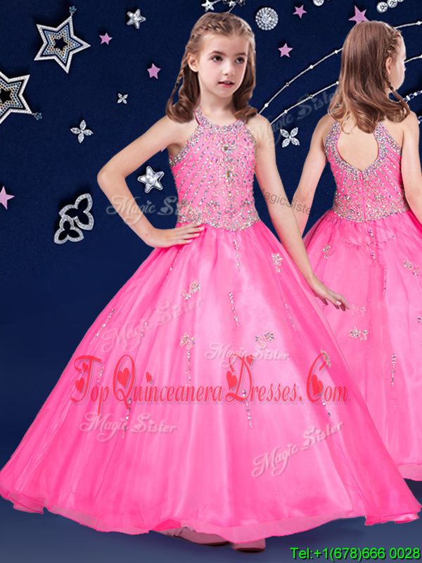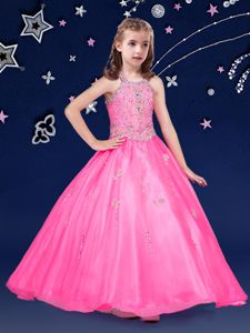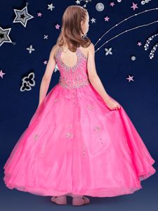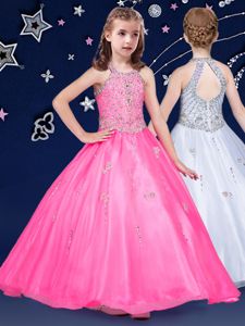 Adorable Halter Top Floor Length Zipper Little Girl Pageant Dress Hot Pink and In for Quinceanera and Wedding Party with Beading
