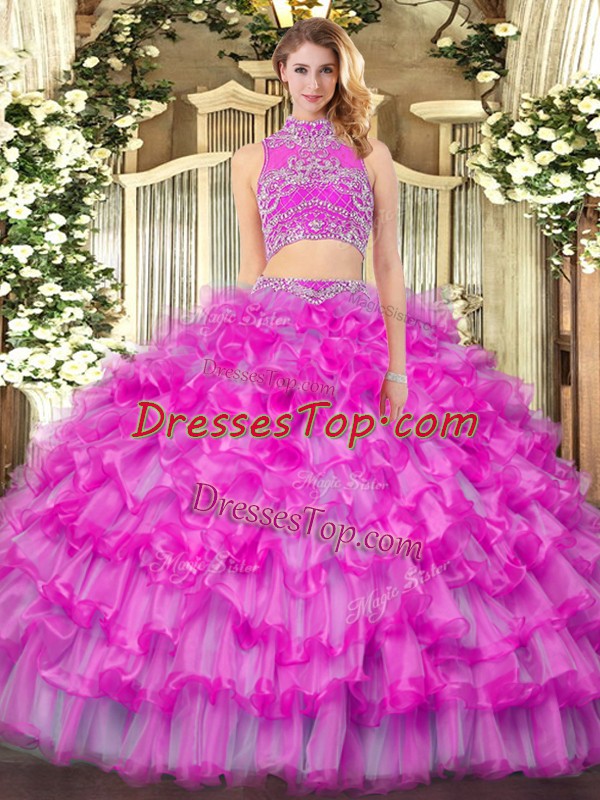 Adorable Lilac Two Pieces Beading and Ruffled Layers 15 Quinceanera Dress Backless Tulle Sleeveless Floor Length