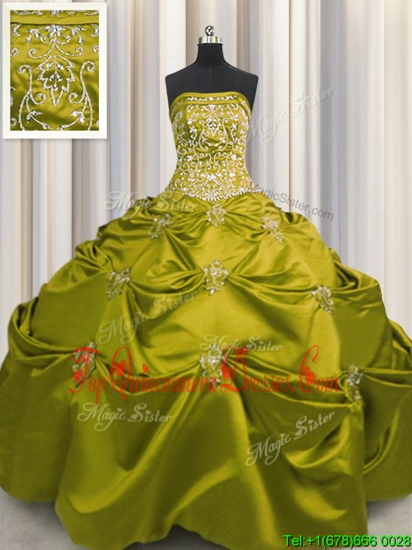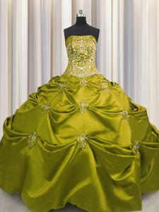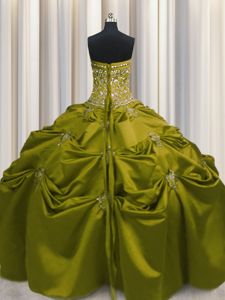 Adorable Olive Green Taffeta Lace Up Strapless Sleeveless Floor Length Quince Ball Gowns Beading and Appliques and Embroidery