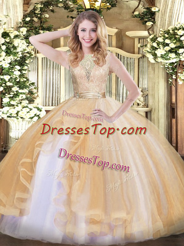 Adorable Sleeveless Organza Floor Length Backless Sweet 16 Dress in Champagne with Lace and Ruffles