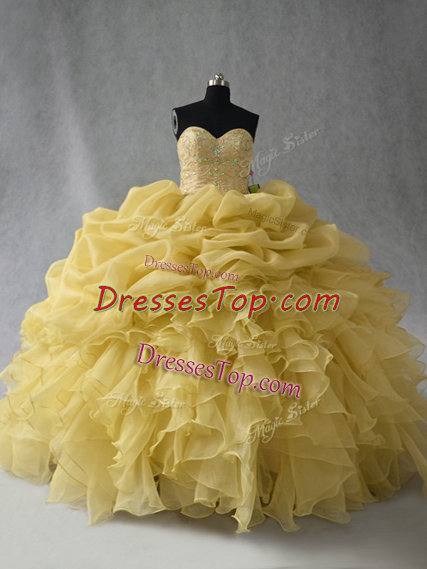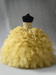 Adorable Yellow Organza Lace Up Sweetheart Sleeveless Floor Length Quinceanera Gowns Beading and Ruffles