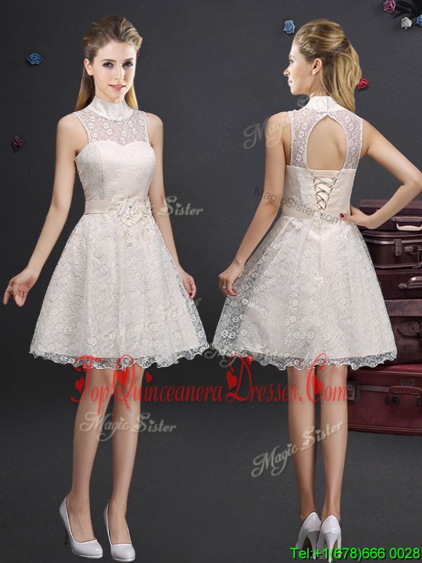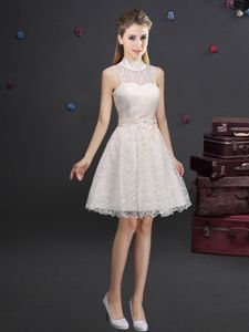 Affordable A-line Quinceanera Court Dresses Champagne High-neck Lace Sleeveless Knee Length Lace Up