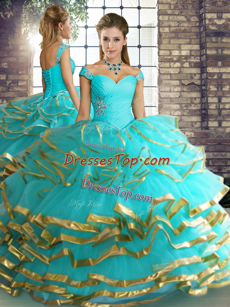 Affordable Ball Gowns Quince Ball Gowns Aqua Blue Off The Shoulder Tulle Sleeveless Floor Length Lace Up