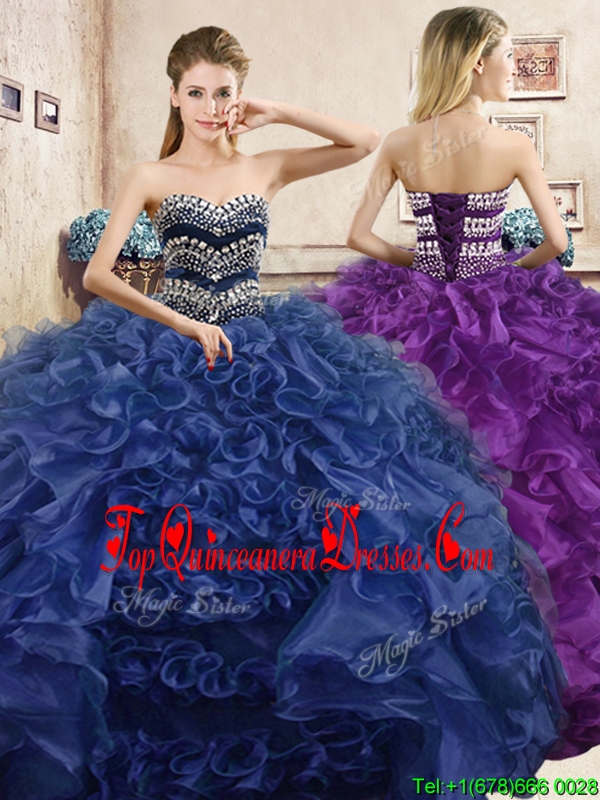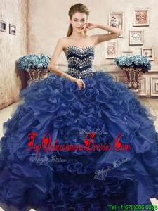 Affordable Beaded and Ruffled Organza Quinceanera Dress in Navy Blue