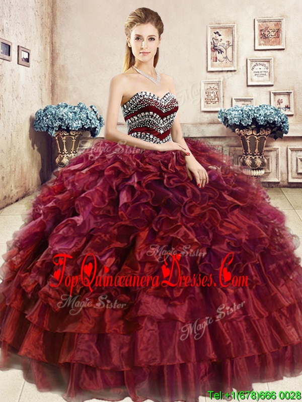 Affordable Beaded and Ruffled Wine Red Sweet 16 Dress in Organza