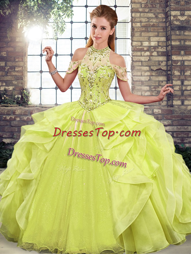 Affordable Beading and Ruffles Sweet 16 Dress Yellow Green Lace Up Sleeveless Floor Length