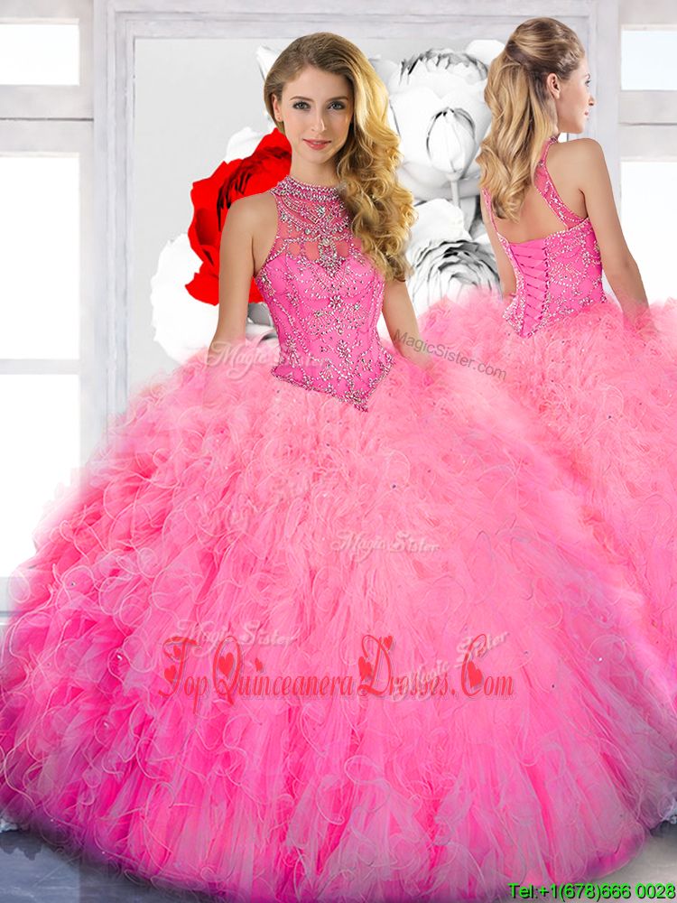 Affordable Beading Sweet 16 Dresses Baby Pink Lace Up Sleeveless Floor Length