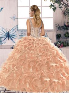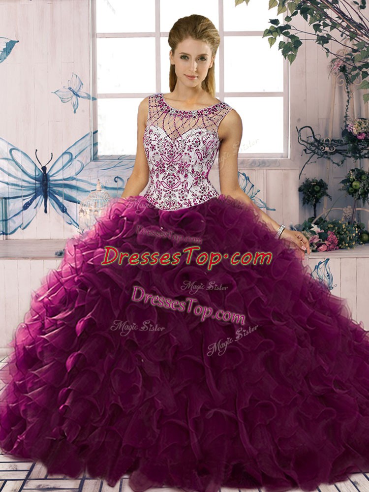 Affordable Dark Purple Ball Gowns Scoop Sleeveless Organza Floor Length Lace Up Beading and Ruffles Quinceanera Gown