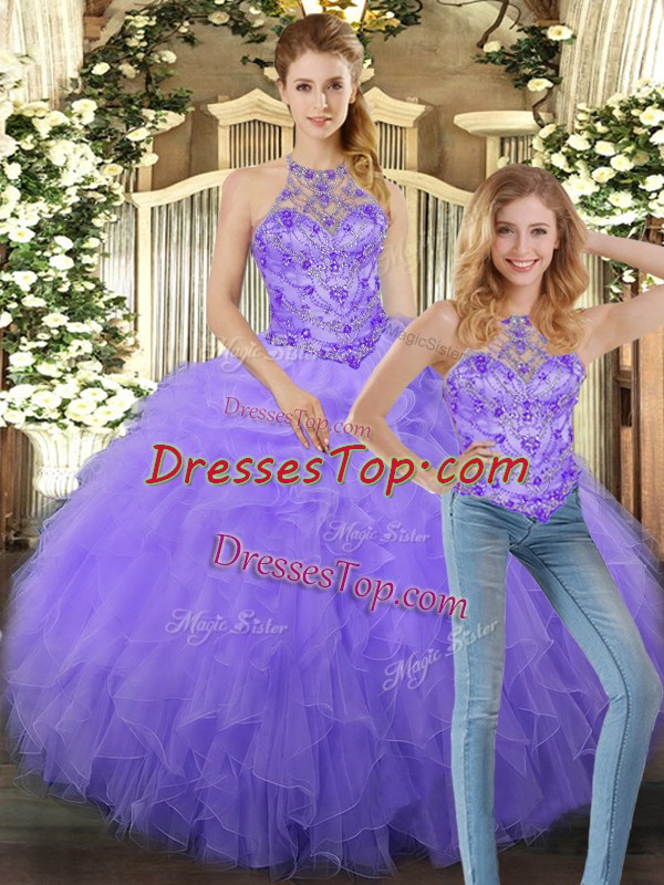 Affordable Floor Length Lavender Quinceanera Gown Tulle Sleeveless Beading and Ruffles