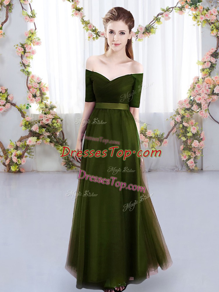 Affordable Floor Length Olive Green Quinceanera Court Dresses Tulle Short Sleeves Ruching