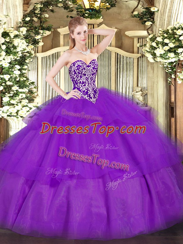 Affordable Purple Ball Gowns Sweetheart Sleeveless Tulle Floor Length Lace Up Beading and Ruffled Layers Quinceanera Gown