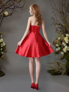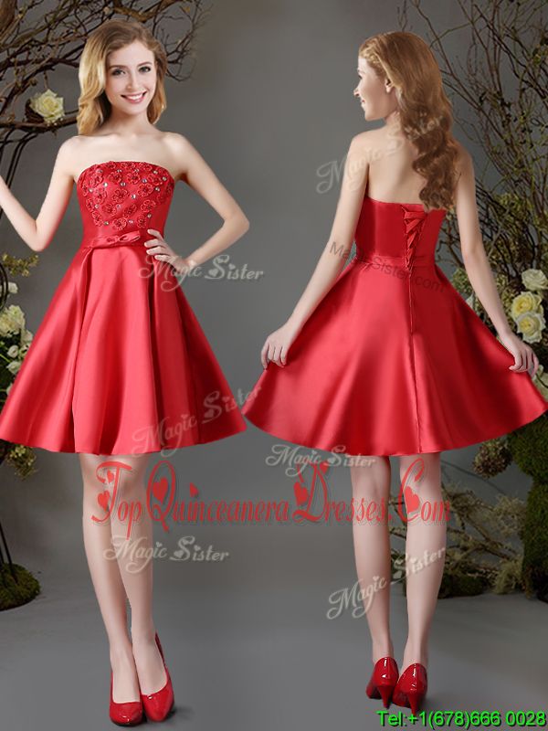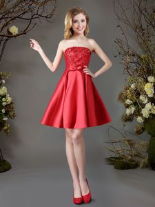 Affordable Red Satin Lace Up Strapless Sleeveless Mini Length Dama Dress for Quinceanera Appliques and Bowknot