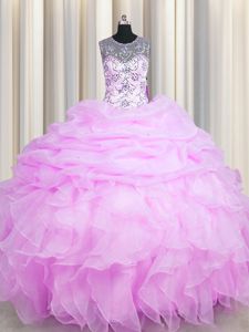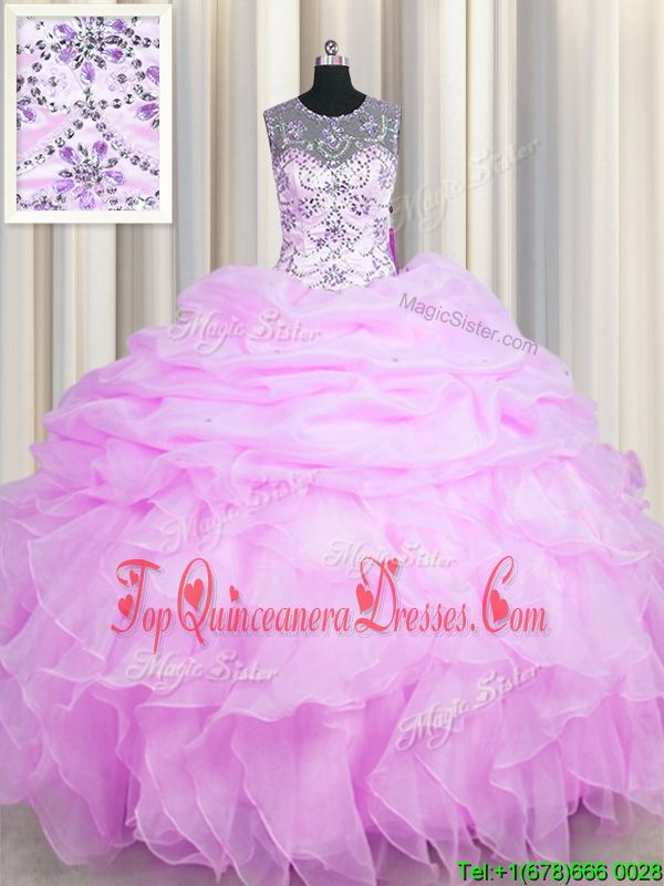 Affordable See Through Organza Scoop Sleeveless Lace Up Beading and Ruffles and Pick Ups Sweet 16 Quinceanera Dress in Lilac