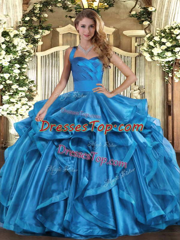 Affordable Sleeveless Floor Length Ruffles Lace Up Quinceanera Dresses with Baby Blue