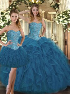 Affordable Teal Ball Gowns Tulle Sweetheart Sleeveless Beading and Ruffles Floor Length Lace Up Sweet 16 Dresses