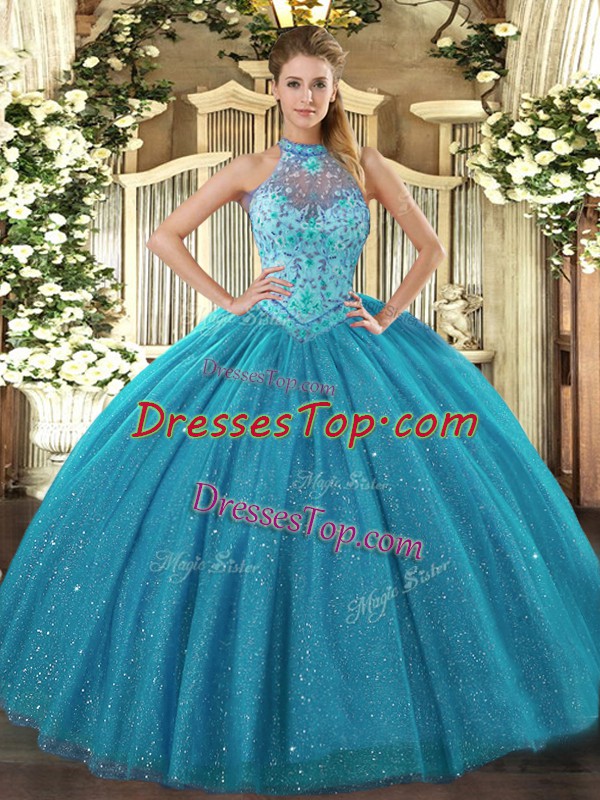 Amazing Halter Top Sleeveless Tulle 15 Quinceanera Dress Beading and Embroidery Lace Up